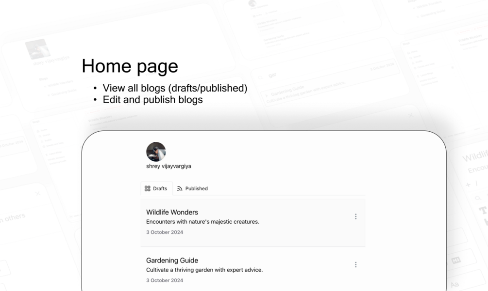 - Go to "/dashboard" you can view all drafts and published blogs