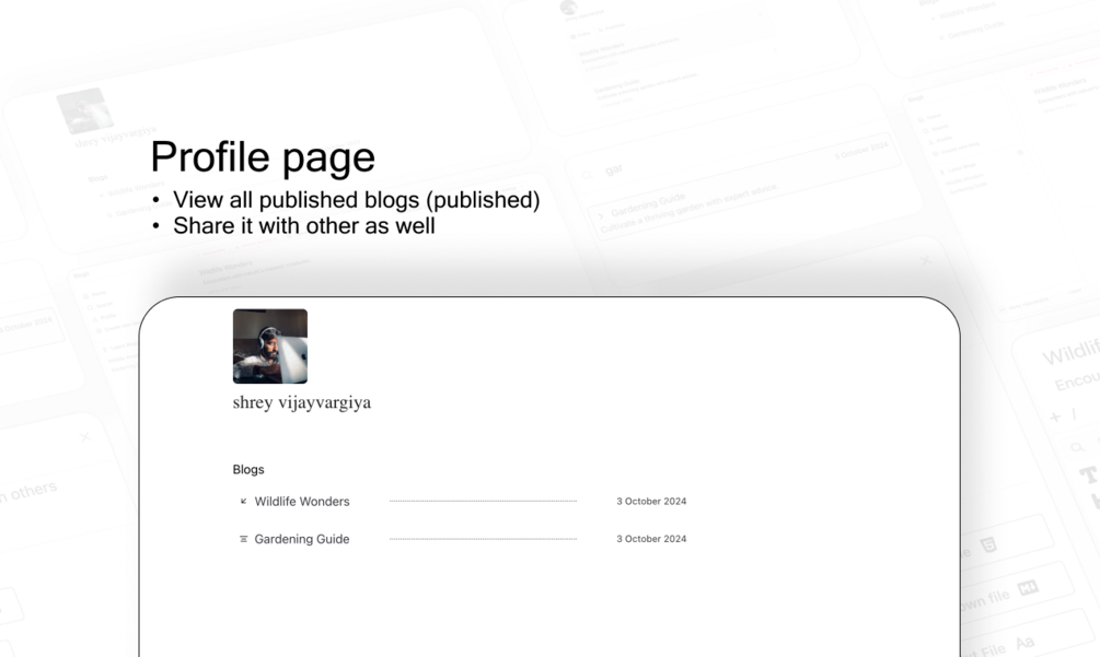 - Public Profile & Blog Sharing: Showcase your work through a public profile page, with shareable blog links
