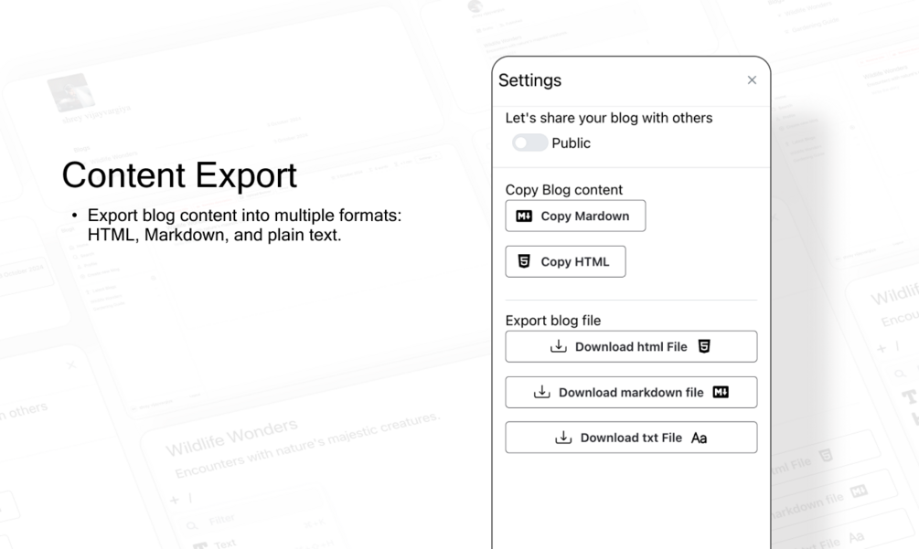- Export blog content into multiple formats: HTML, Markdown, and plain text.