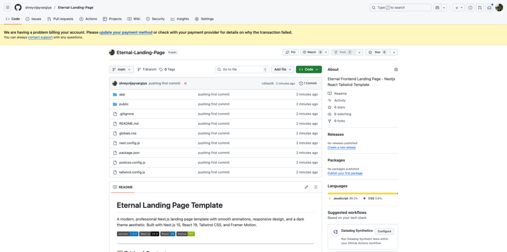 You get clean, readable code, reusable sections, and easy customization options through a centralized config file (constants.js). Whether youβre building an AI startup, a SaaS product, or a personal portfolio, Eternal helps you go live faster β without sacrificing design quality.