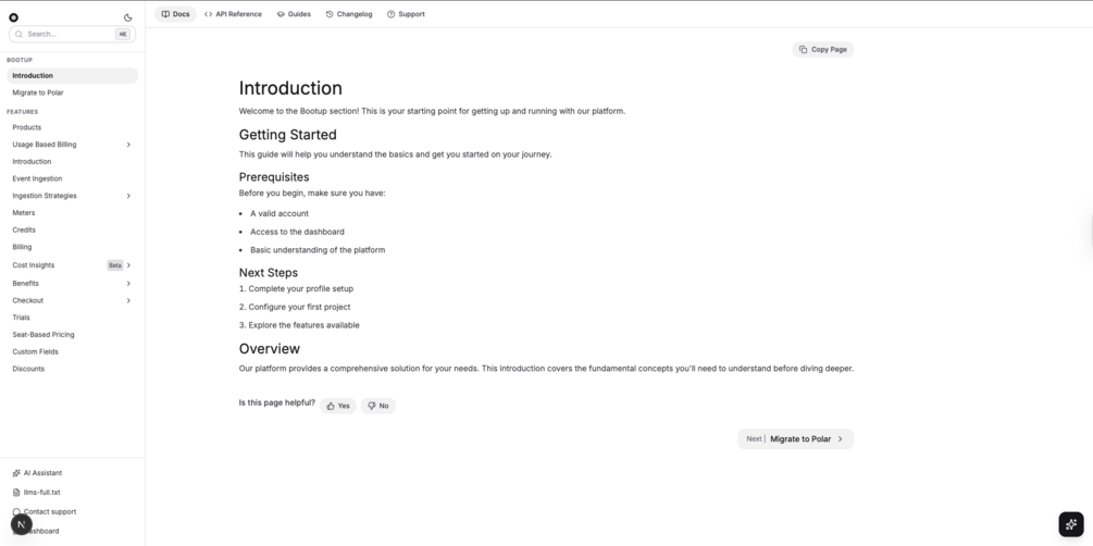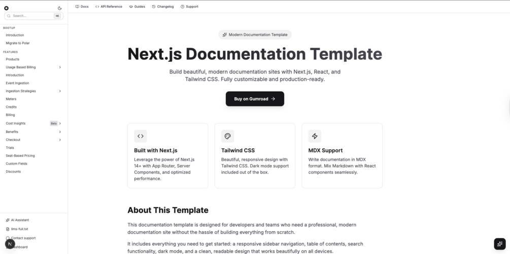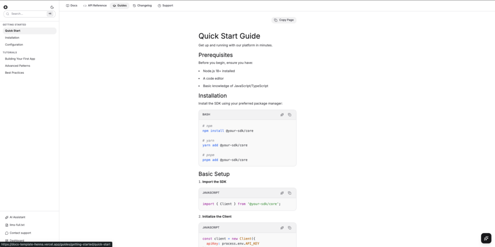 Stop spending weeks building documentation from scratch. This production-ready documentation template gives you everything you need to launch a beautiful, professional documentation site in minutes. Built with the latest technologies and best practices, it's perfect for SaaS products, APIs, developer tools, or any project that needs world-class documentation.