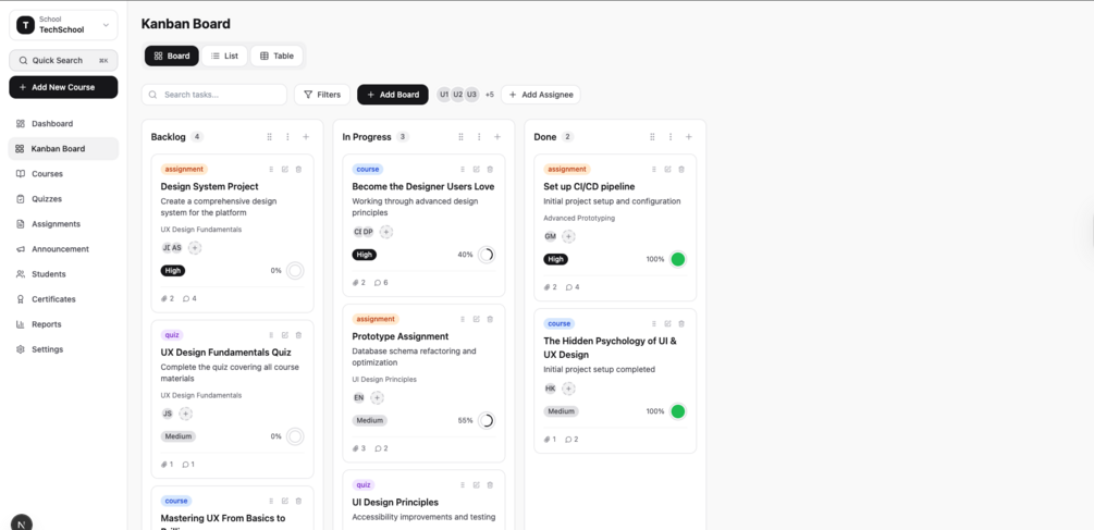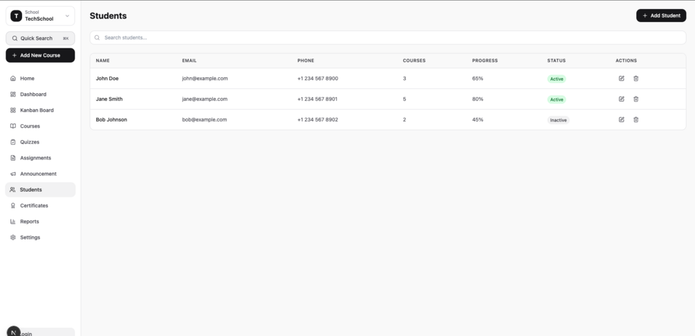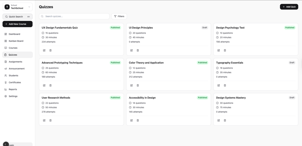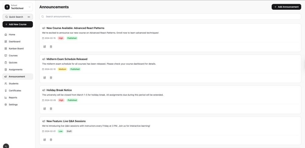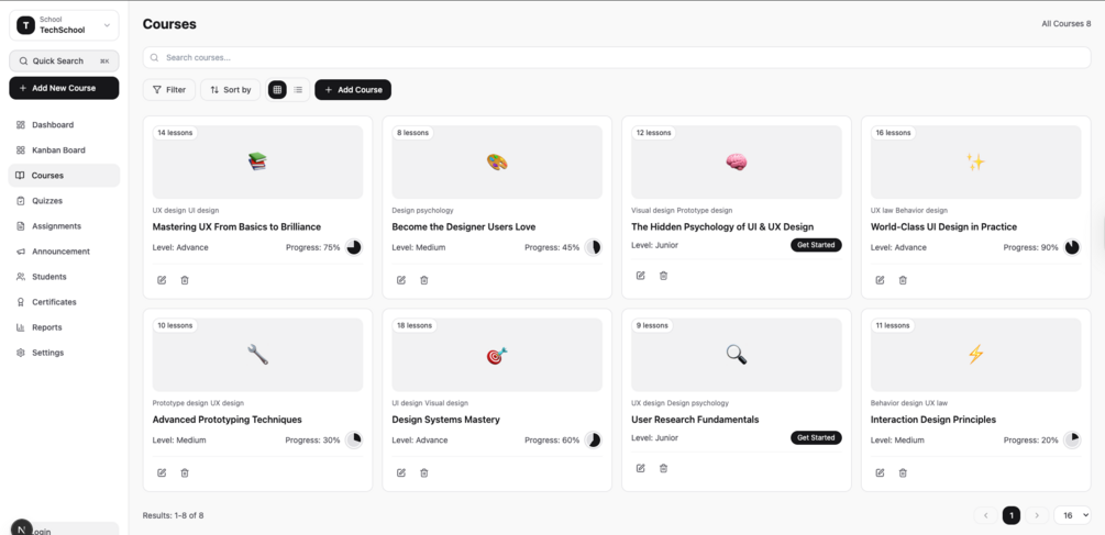 TechSchool is a Next.js-based Learning Management System (LMS) template for building online learning platforms. It includes a modern UI, responsive design, and the core features needed to launch an educational platform.