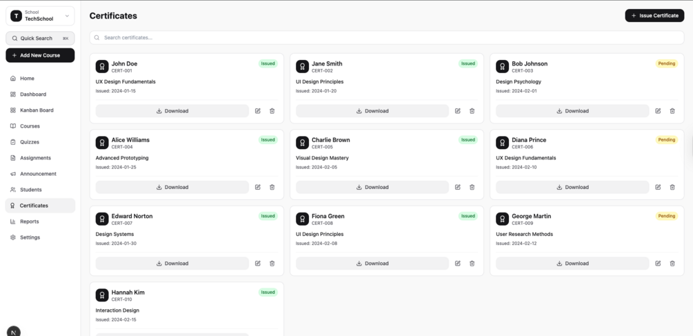 - Key metrics (courses, students, certificates, completion rate)