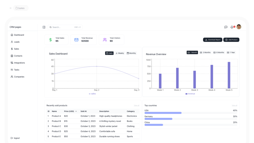 SAAS CRM frontend react template is the modern way to build custom CRM for any SAAS product.